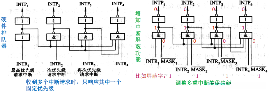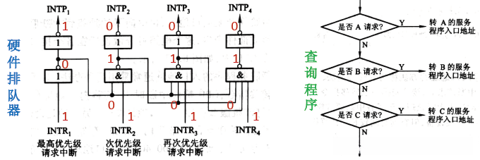 | 硬件实现 | 通过硬件排队器 实现,它既可以设置在CPU中,也可以分散在各个中断源中 | ||