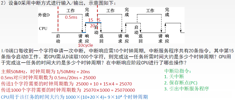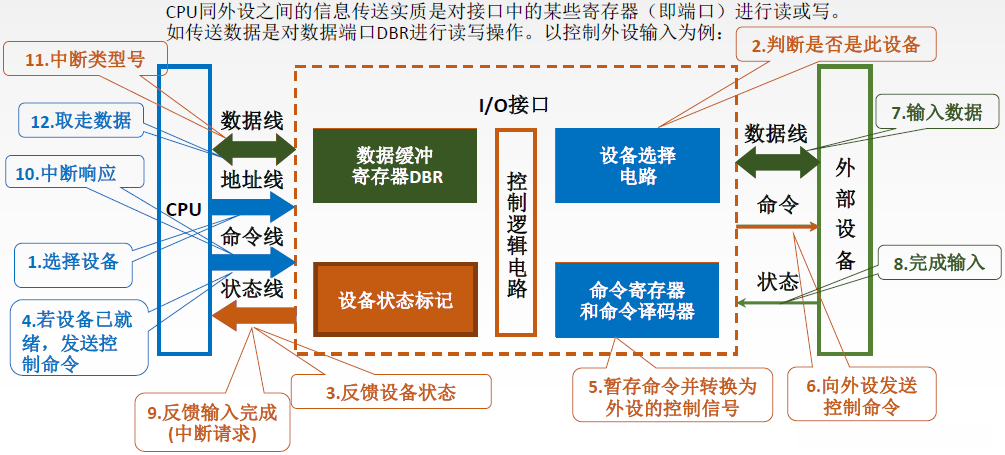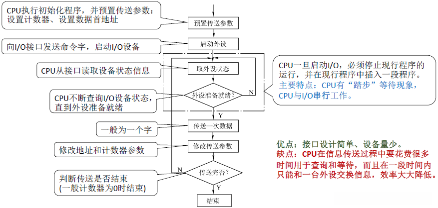 | 缺点 | CPU在数据传输过程中需消耗大量时间用于状态查询与等待; 如果采用独占查询方式, 则每次只能与一台外设交换信息, 导致工作效率显著下降 | ||