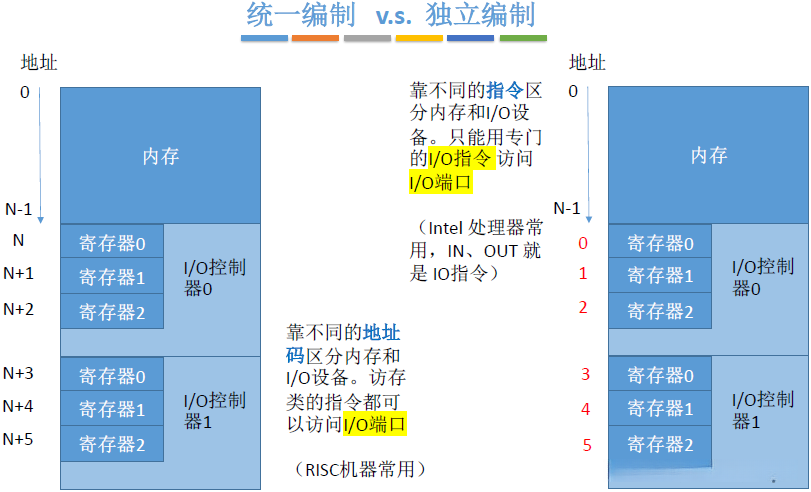 - 通过不同类型的指令区分内存与外围设备(其中访问外围设备需使用特定的I/O指令)。