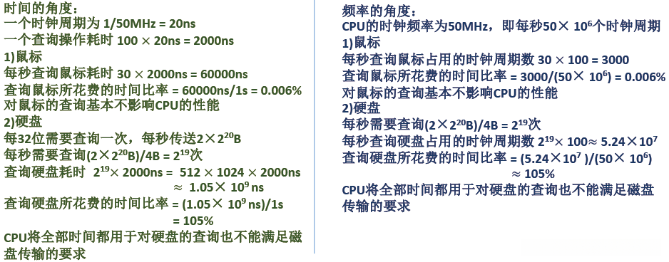 |例题|题目|在程序查询方式的输入/输出系统中,假设不考虑处理时间,每一个查询操作需要100个时钟周期,CPU的时钟频率为50MHz。现有鼠标和硬盘两个设备,而且CPU必须每秒对鼠标进行30次查询,硬盘以32位字长为单位传输数据,即每32位被CPU查询一次,传输率为2×220B/s。求CPU对这两个设备查询所花费的时间比率,由此可得出什么结论?||