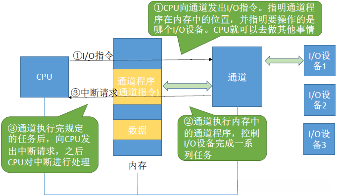 - 将预先编写的通道程序放置于主存内存区域