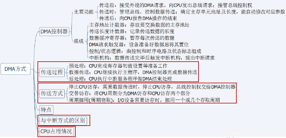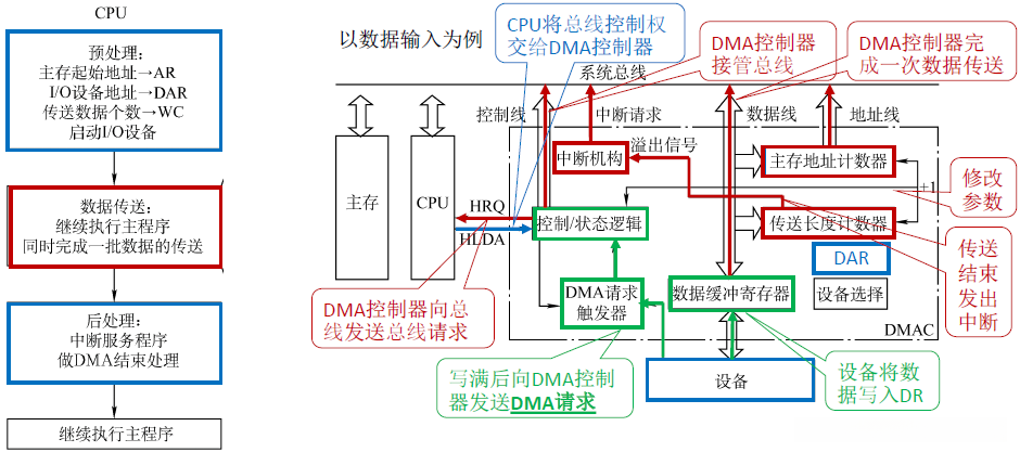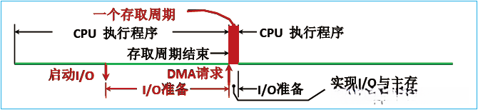 | 三种 可能 | DMA 访问主存有三种可能: CPU 此时不访存(不冲突) CPU 正在访存**(存取周期结束让出总线)** CPU与DMA****同时请求访存 (I/O****访存优先 )【如果DMA中数据缓冲器的数据不及时写入主存,那么外部设备继续往里冲入数据,导致数据丢失】 |