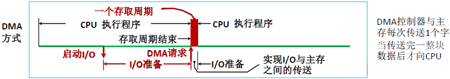 每次机器周期结束时,总线是空闲的,然后DMA就能趁机传送一个字**,当整块数据传送完毕,才向CPU发送中断请求命令** | DMA方式具有下列特点: ①它使主存与CPU的固定联系脱钩,主存既可被CPU访问,又可被外设访问。 ②在数据块传送时,主存地址的确定、传送数据的计数等都由硬件电路直接实现。 ③主存中要开辟专用缓冲区,及时供给和接收外设的数据。 ④ DMA传送速度快,CPU和外设并行工作,提高了系统效率。 ⑤ DMA在传送开始前要通过程序进行预处理 ,结束后要通过中断方式进行后处理 。 |