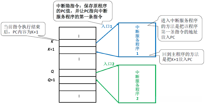 |引出中断服务程序|引出中断服务程序的过程主要包括确定其入口地址,并通过这种方式将地址传递给当前主程中的PC寄存器——软件查询法与硬件向量法|||||
