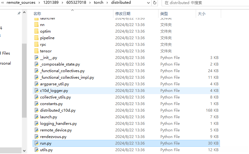 3. 点击torch文件夹,找到旗下distributed文件夹,再找到run.py