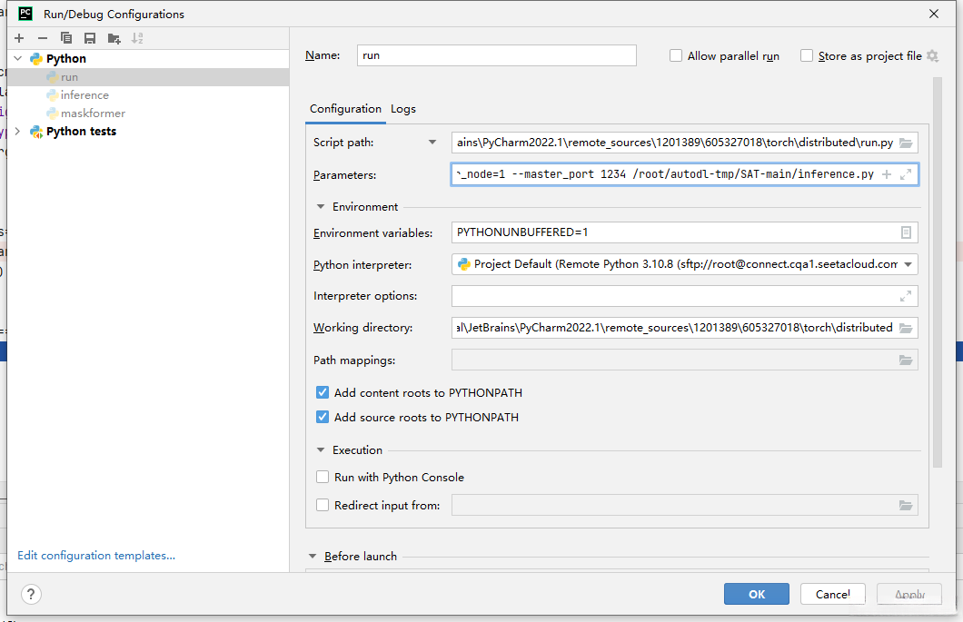 5. Edit Configuration run.py【注意这里Parameter其中的inference.py需要使用在服务器上的绝对路径,因为run.py和inference.py位置相差很远,不能用相对路径表示】