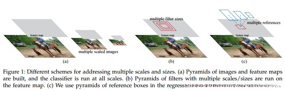 RPN旨在有效预测具有广泛尺度和纵横比的区域提案。与使用图像金字塔(图1,a)或过滤器金字塔(图1,b)的流行方法[8],[9],[1]作为多种尺度和长宽比的参考。我们的方案可以被认为是回归参考金字塔(图1,c),它避免了枚举多个比例或长宽比的图像或过滤器。这个模型在使用单一尺度的图像进行训练和测试时运行良好,从而有利于运行速度。
