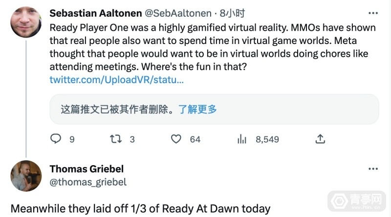本周有消息报道了Meta在2023年的'效率年'实施了一系列改革措施,在第二批次首轮 layoffs中裁掉了约4,000人。这些裁减主要影响旗下相关工作室——包括Ready at Dawn和Downpour Interactive——均经历了一定比例的裁员