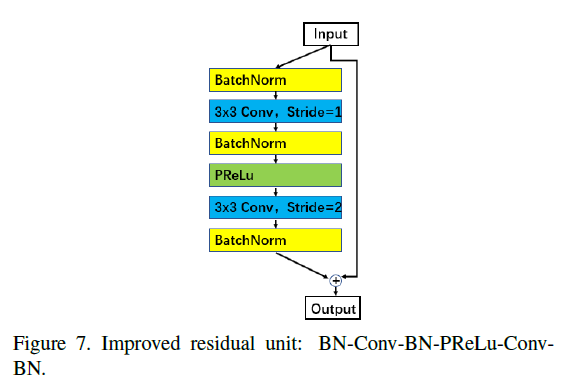 基于现有的ResNet单元框架之外,在本次研究中我们开发了一种更适合训练人脸识别模型的残差模块设计,在图7中展示了这一改进型残差结构(命名为'IR'),其具体架构由BN-Conv-BN-PRelu-Conv-BN组成。通过对比实验发现,在第二层卷积操作中将步距设定为2比首层更为合理;此外,在本节方法中采用PReLU而非传统的ReLU激活函数