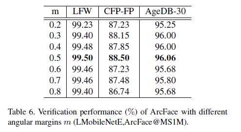 边界的参数ms对弧面算法具有至关重要的影响,在本研究中我们进行了系列实验以探索最佳的角度界限。其中参数m的取值范围设定为[0,8]之间。通过采用LMobileNetE网络架构并结合ArcFace损失函数,在经过重新优化的MS1M数据集上进行模型训练。如表6所示的结果表明,在m∈[0,5]时(即m∈[0,5]),实验结果均显示出性能持续提升趋势。当m>0,5时(即m>0,5),验证集上的准确率出现了下降趋势。在此研究中,默认将可调节的角界限设为m=0,5