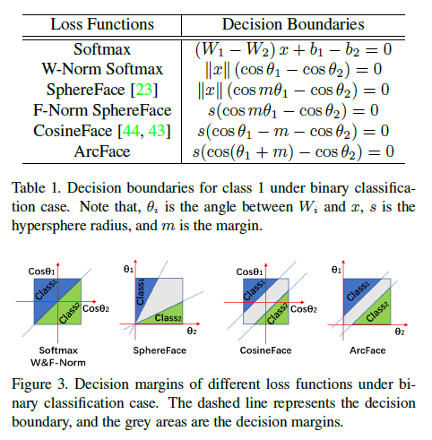 为了更深入地理解从 softmax 到 ArcFace 的这一过程, 我们展示了该条件下的决策边界, 如表1和图3所示. 通过归一化处理权重与特征, 所提出的方法在此处具有显著的优势.