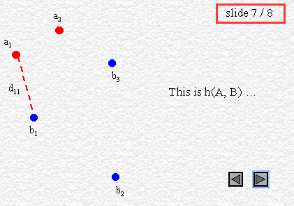 即: 即 A集合中的任一点ai 到集合B中的任意点的最短的距离di,然后在这些距离di中选择距离最长(远) 的,即作为两个集合A与B之间的Hausdoff Distance。