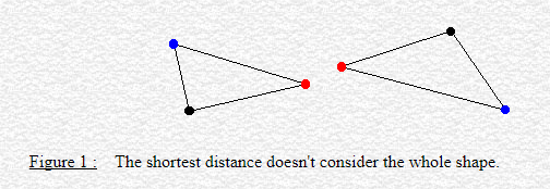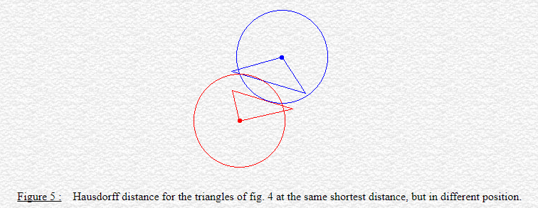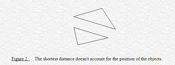 Another example is given by fig. 2, where we have the same two triangles at the same shortest distance than in fig. 1, but in different position. It's quite obvious that the shortest distance concept carries very low informative content, as the distance value did not change from the previous case, while something did change with the objects.