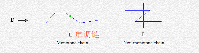 (1)单调链: 链条C(连续的边)如果是在D方向上是单调的, 则与D方向正交的直线L 与C的交点只有一个,则说明C在D向是单调的。