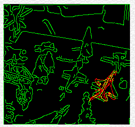 We want to find if the small image is present, and where, in the large image. The first step is to extract the edges of both images, so to work with binary sets of points, lines or polygons :
