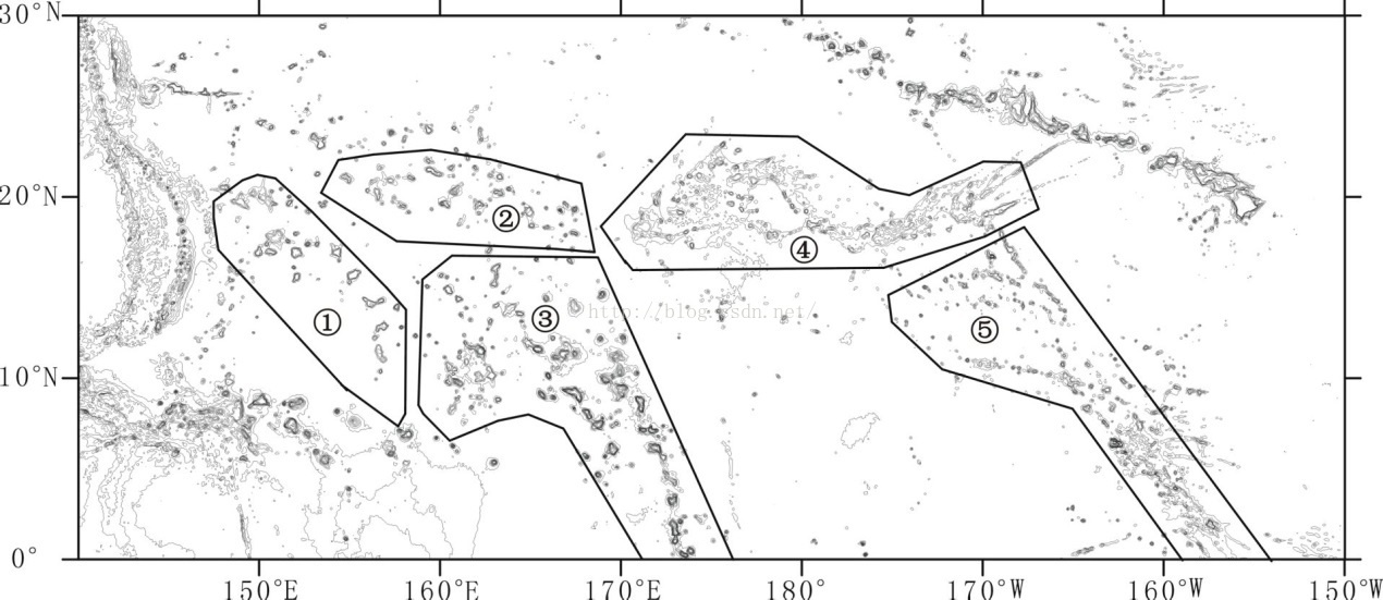 通过图框的两个角的坐标确定范围,分别是左上(140°E,30°N);右下(150°W,30°N)