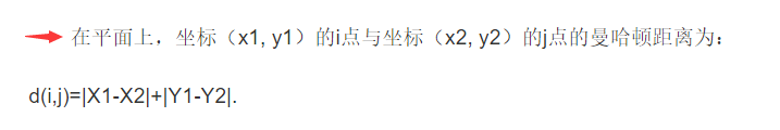 定义 曼哈顿距离 对于一个具有正南正北正东正西方向规则布局的地图来说,从一点到达另一点的距离正是在南北方向上移动的距离加上在东西方向上移动的距离,因此,曼哈顿距离又称为出租车距离。简称为:两个点在标准...