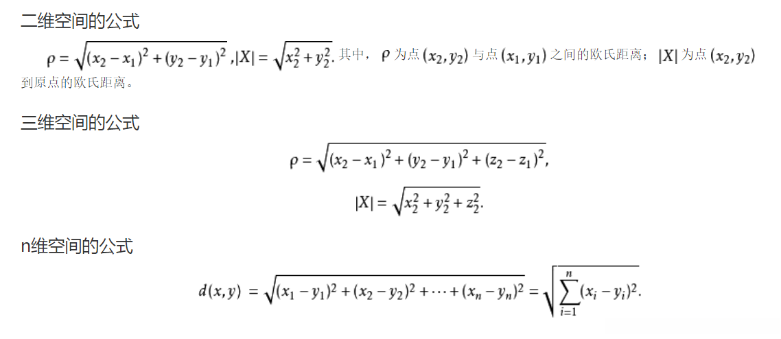 1\.欧氏距离EuclideanDistance 欧氏距离是最容易直观理解的距离度量方法,我们小学、初中和高中接触到的两个点在空间中的距离一般都是指欧氏距离。