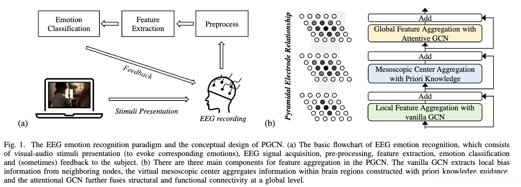 与之前大多只使用二维电极关系进行GCN构建的工作相比,PGCN将节点之间的绝对位置、相对位置和数值关系融合到网络中,同时借鉴情感相关的神经科学先验研究,构建大脑区域的虚拟中观中心。为了实现这一目标,我们构建了PGCN,它从局部、中观到全局三个层次聚合EEG特征。本工作的主要贡献如下: