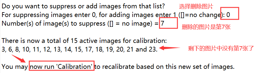 在命令窗口中输入用于增加和删除图像的数字代码。然后依次输入要操作的图像编号。可选择将第7步中误差较大的图像删除,并重新执行标定过程。