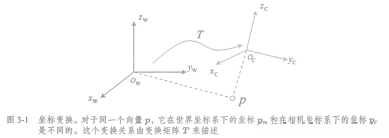 在两个坐标系之间的转换通常表现为一次旋转变换后跟上一次平移操作。这通常被称为刚性变换(rigid transformation)。其显著特征是任何向量在不同坐标系中的长度及其之间的夹角均保持不变。