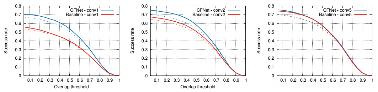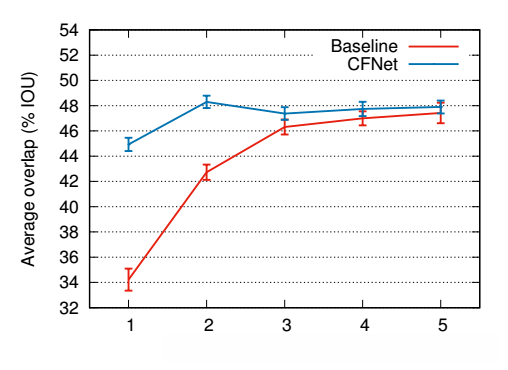 此图证明了CFNet并没有因为特征网络更深而表现出性能更好。此外,当特征提取网络达到5层情况下,CFNet的跟踪效果与基线算法SIamsesFC具有相似的精度,因此CFNet的优势应该表现在浅层网络上,即作者谈到的light-architecture。