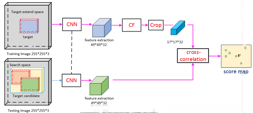 图一:CFNet整体架构。非对称的孪生网络,非对称部分是由于correlation filter部分引起的,作者是想把cf引入到神经网络中,从而能够实现end-to-end优化。training images和testing images首先都经过相同的卷积特征提取网络提取特征,其中training images提取出来的卷积特征进而通过correlation filter得到线性模板,这个线性模板将通过与testing images的特征图进行交叉相关进而得到目标定位的响应图。
