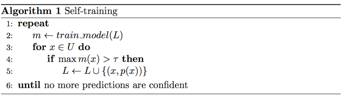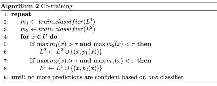 Co-training [3] 有 m1 和 m2 两个模型,它们分别在不同的数据集上训练。每轮迭代中,如果两个模型里的一个模型,比如模型 m1 认为自己对样本 x 的分类是可信的,置信度高,分类概率大于阈值 τ ,那 m1 会为它生成伪标签,然后把它放入 m2 的训练集。