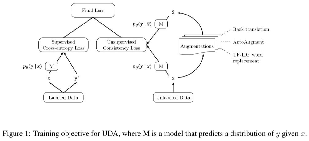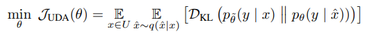 公式中 x 是原始未标记数据的输入, 是对未标签数据进行增强(如:图像上进行 AutoAugmen,文本进行反翻译)后的数据。