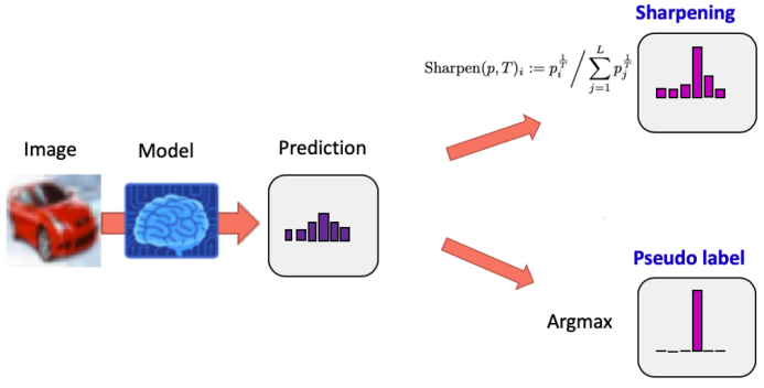 最受欢迎的两种方式是锐化方法和 Argmax 方法。前者在保持预测值分布的同时使分布有些极端;后者仅使用对预测具有最高置信度的预测标签进行标记。如下所示: