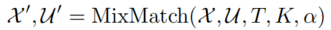 与过去使用 MixUp 工作不同,将标记的示例与未标记的示例“混合”在一起,并发现提升了性能。具体地,将有标签数据 X 和无标签数据 U 混合在一起形成一个混合数据 W。