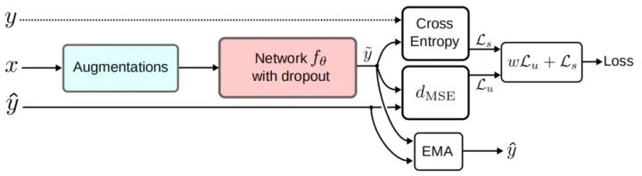 具体来说,由于正则化技术(例如 data augment 和 dropout)通常不会改变模型输出的概率分布,Pi-Model 正是利用神经网络中这种预测函数的特性,对于任何给定的输入 x,使用不同的正则化然后预测两次,而目标是减小两次预测之间的距离, 提升模型在不同扰动下的一致性 ,Pi-Model 使用 MSE 做为两个概率分布之间的损失函数。