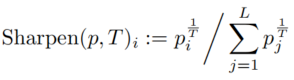 Sharpening 是一个很重要的过程,这个思想相当于深度学习中的 relu 过程。 在给定预测的平均值的基础上,应用锐化函数减小了标签分布的熵。如下: