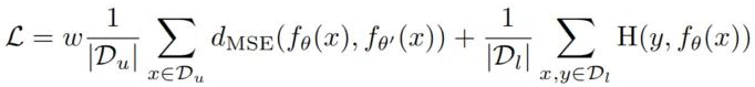 损失函数:由两部分构成,如下所示,其中第一项含有一个时变系数 w,用来逐步释放此项的权重,x 是未标记数据,由两次前向运算结果的均方误差(MSE)构成。第二项由交叉熵构成,x 是标记数据,y 是对应标签,仅用来评估有标签数据的误差。可见,第一项即是用来实现一致性正则。
