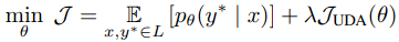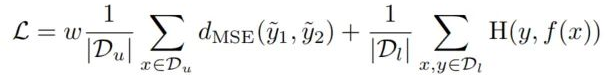 (2)为了同时使用有标记的数据和未标记的数据,添加了标记数据的 Supervised Cross-entropy Loss 和上式中定义的一致性/平滑性目标 Unsupervised Consistency Loss,权重因子 λ 为我们的训练目标,最终目标的一致性损失函数定义如下: