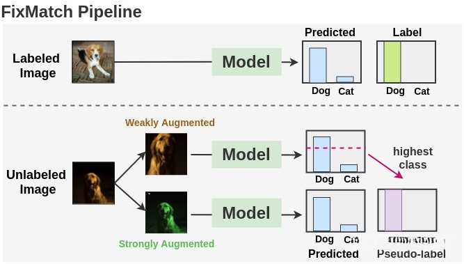 FixMatch 是对弱增强图像与强增强图像之间的进行一致性正则化,但是其没有使用两种图像的概率分布一致,而是使用弱增强的数据制作了伪标签,这样就自然需要使用交叉熵进行一致性正则化了。此外,FixMatch 仅使用具有高置信度的未标记数据参与训练。