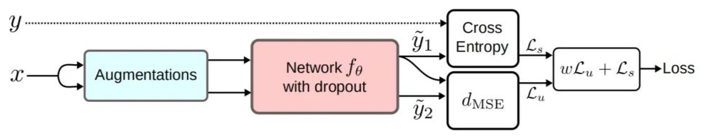 训练过程如上图所示:对每一个参与训练的样本,在训练阶段,Pi-Model 需要进行两次前向推理 。此处的前向运算,包含一次随机增强变换和不做增强的前向运算。由于增强变换是随机的,同时模型采用了 Dropout,这两个因素都会造成两次前向运算结果的不同。