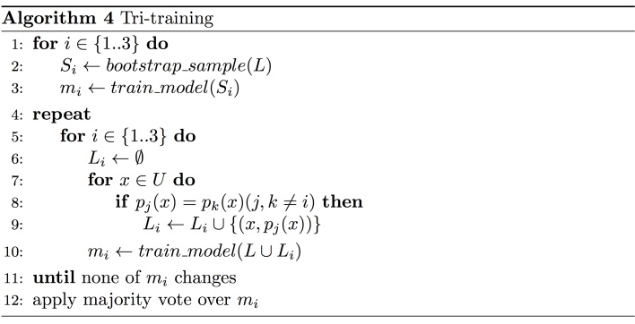 Tri-training [4] 首先对有标记示例集进行可重复取样(bootstrap sampling)以获得三个有标记训练集,然后从每个训练集产生一个分类器。
