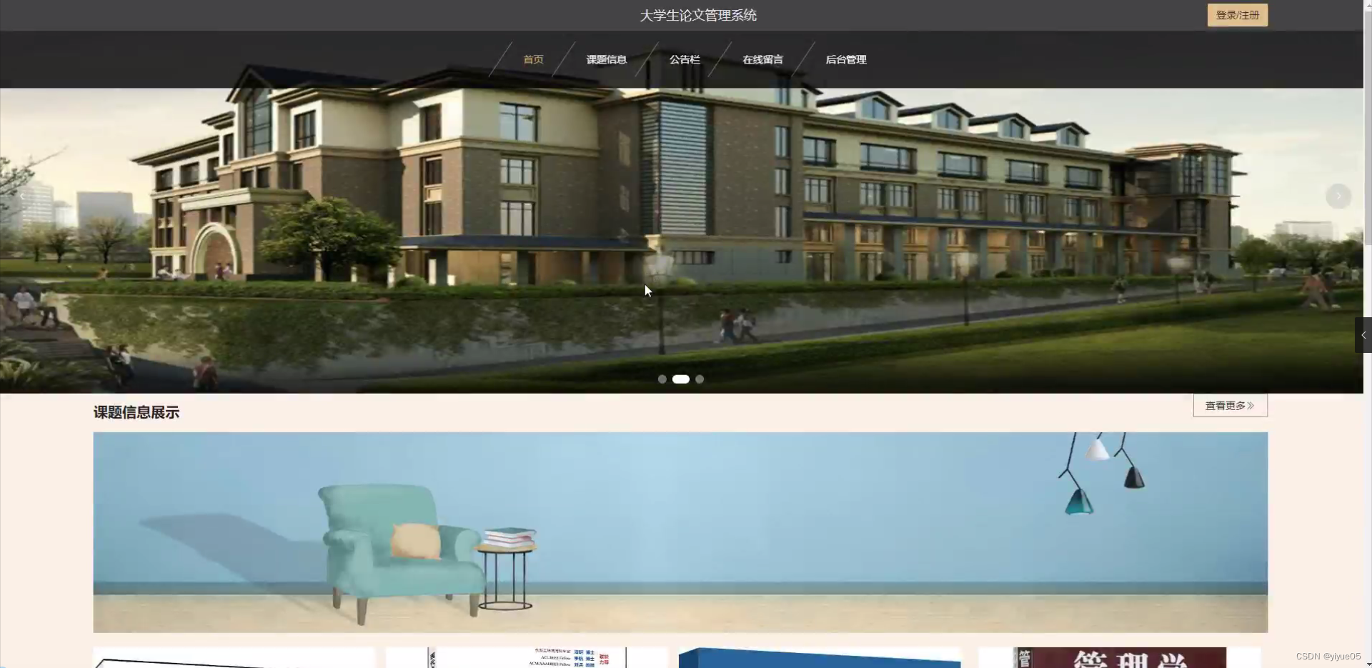 研究内容: 本研究的内容主要包括以下几个方面:首先,对大学生论文管理系统的功能需求进行详细分析和规划,包括学生、教师、院系、专业、班级、课题信息、学生选题、学生拟题、论文提交和论文成绩等功能模块的设计和实现。其次,选择合适的技术和工具,如数据库管理系统、前端开发框架等,进行系统的架构设计和开发。然后,进行系统的测试和优化,确保系统的稳定性和性能。最后,对系统进行实施和应用,收集用户反馈和数据,进行系统的评估和改进。通过以上研究内容的完成,可以实现一个高效、智能的大学生论文管理系统,为大学生论文管理提供技术支持和创新思路。