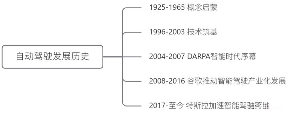 智能驾驶技术的发展历程始于二十世纪二十年代,并经历了五个关键发展阶段: