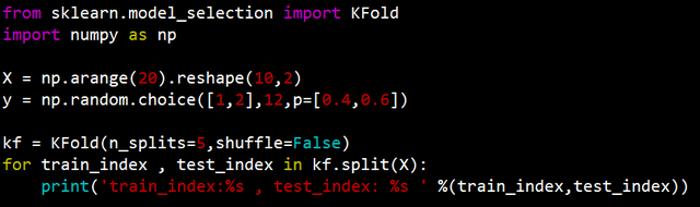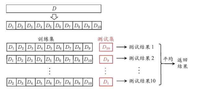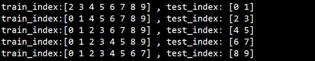 上述例子中共有10个样本,在进行五折交叉验证时对测试集索引进行了查看。所有样本集的并即构成整个样本集合,在每次循环中将其中一个样本作为训练数据、剩余两个作为测试数据使用;然后基于这五组训练-测试划分方案评估模型性能,并计算其平均表现以获得最终结果。