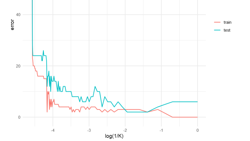 当上述不等式成立时,在自变量\log\left(\frac{1}{K}\right)增加的过程中(即K值降低到某个程度),对应的\text{training error}会随之减小。