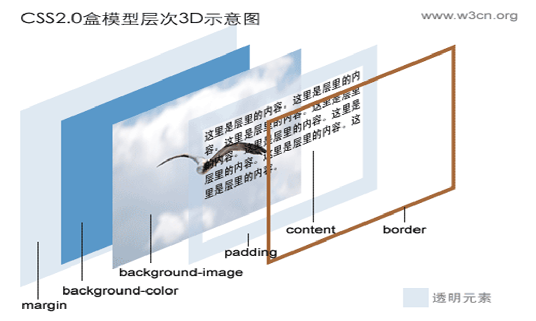 margin 与其他属性如 background-color 、 background-image 、 padding 、 content 和 border 的层次关系及其相互影响是关键。