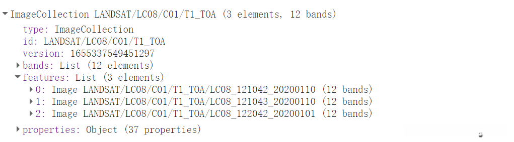整个去云处理这一过程较为简便。具体流程如下:首先调用所需的TOA影像集合,在本研究中采用Landsat8数据集进行分析。随后使用所需TOA影像集合的时间范围设定为2020年1月,并通过控制台输出结果界面。结果显示共有三幅影像被成功获取。