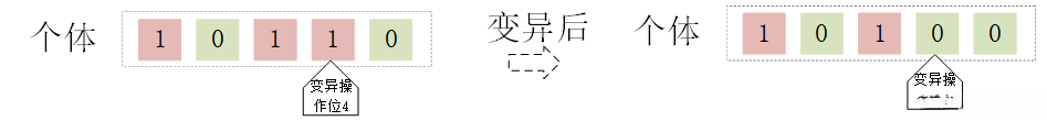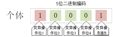 该过程模拟基因突变的现象,并且由于其发生概率与交叉操作不同,在实际应用中两者的效果存在显著差异。为了执行变异操作,在给定的条件下(即当个体的适应度满足一定标准时),系统会自动触发相应的遗传算法步骤;通过两个独立的随机数生成器分别计算出相应的参数值:一个是用于确定变异发生的概率参数;另一个则用于确定具体的染色体位置变化点坐标参数。例如,在一个由五位二进制编码构成的个体中(即每个个体由五位二进制编码组成),共有五个可能的位置可能发生突变情况;如下图所示: