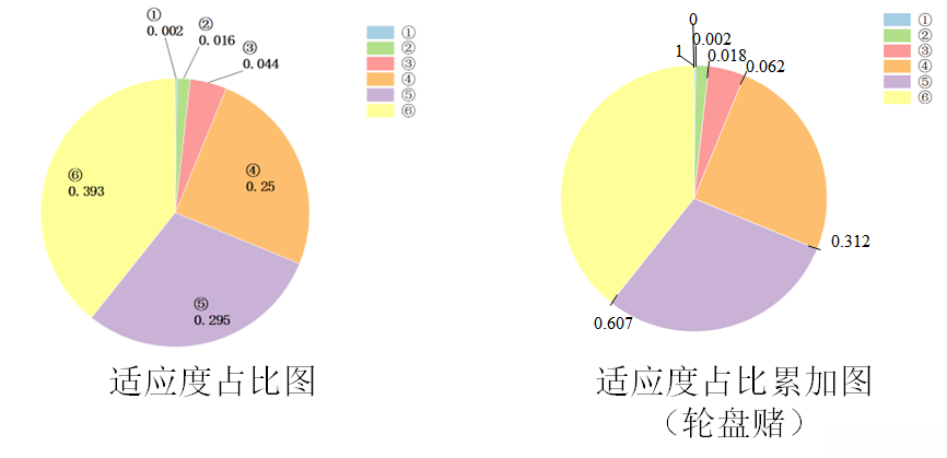 左图为各个体在其总体适应度中所占比例的饼图展示;右图为基于此比例构建的一个圆形概率模型。采用轮盘赌方法时,在每次选择中需要按照个体编号依次调节圆盘。每次转动时利用随机数生成器产生一个随机数值;若该随机数值高于相应个体当前适应度值,则执行复制操作;将此位置对应的个体作为被选中的对象替换掉当前个体。
