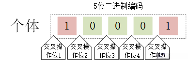 即为将种群中的个体两两配对进行杂交操作。具体而言,在本算法中首先需设定一个交叉阈值(若该个体的交叉概率低于或等于预先设定的阈值,则会执行杂交操作)。在此过程中并采用两个独立的随机数生成器:其中一个生成器用于产生该个体对应的总交叉概率(即所有可能杂交位点的概率之和),另一个则用于决定每个体的具体杂交位置是否被选中进行交换操作(即通过比较该个体与预设阈值的关系来确定)。例如,在具有五个二进制编码构成的单个体中存在五个可能的杂交位点(如图所示)。