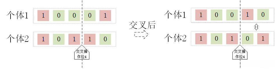 个体³与个体⁴之间会进行杂交操作,并将双方第5位以及后续所有基因片段进行交换。