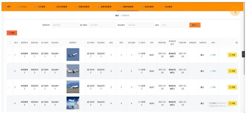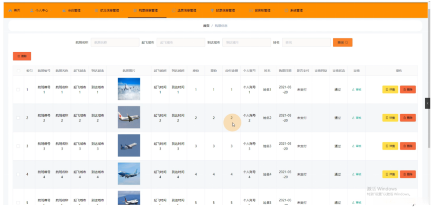购票信息管理功能在该页面提供多种基础数据展示功能。用户可以在该页面浏览以下各项数据:索引项(包括航班编号),航班编号对应的信息(如航班名称),起飞城市及到达城市的相关记录,以及与航班相关的图片资料;此外还包含时间轴数据(如起飞时间和到达时间),座位分配情况(如座位号),票价设置细节(如起程地至目的地的票价计算结果),个人账户关联记录(如个人账号名),乘客个人信息(如乘客姓名),订单生成时间戳(购票日期),支付状态反馈(是否支付成功提示),以及订单处理流程反馈(审核回复内容)。系统还支持根据用户需求选择性地执行删除操作以优化数据结构完整性。