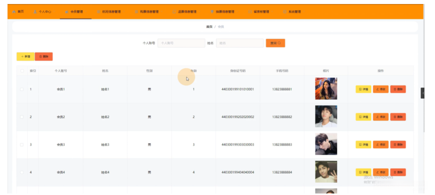 该系统采用先进的数据处理技术,在会员管理界面能够显示索引和账号信息以及基本信息如姓名和性别信息,并支持根据需求对个人信息进行修改或删除操作,请参考图4-8获取详细指导